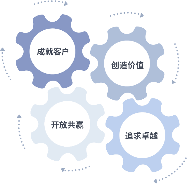成就客户是一切决策的出发点,,,,创造价值是衡量所有工作的标准,,,追求卓越是我们做事做人的态度,,,开放共赢是我们的格局也是最终的结果。。价值观的齿轮环环相扣,,,推动着组织里的每个人不断向前。。。。