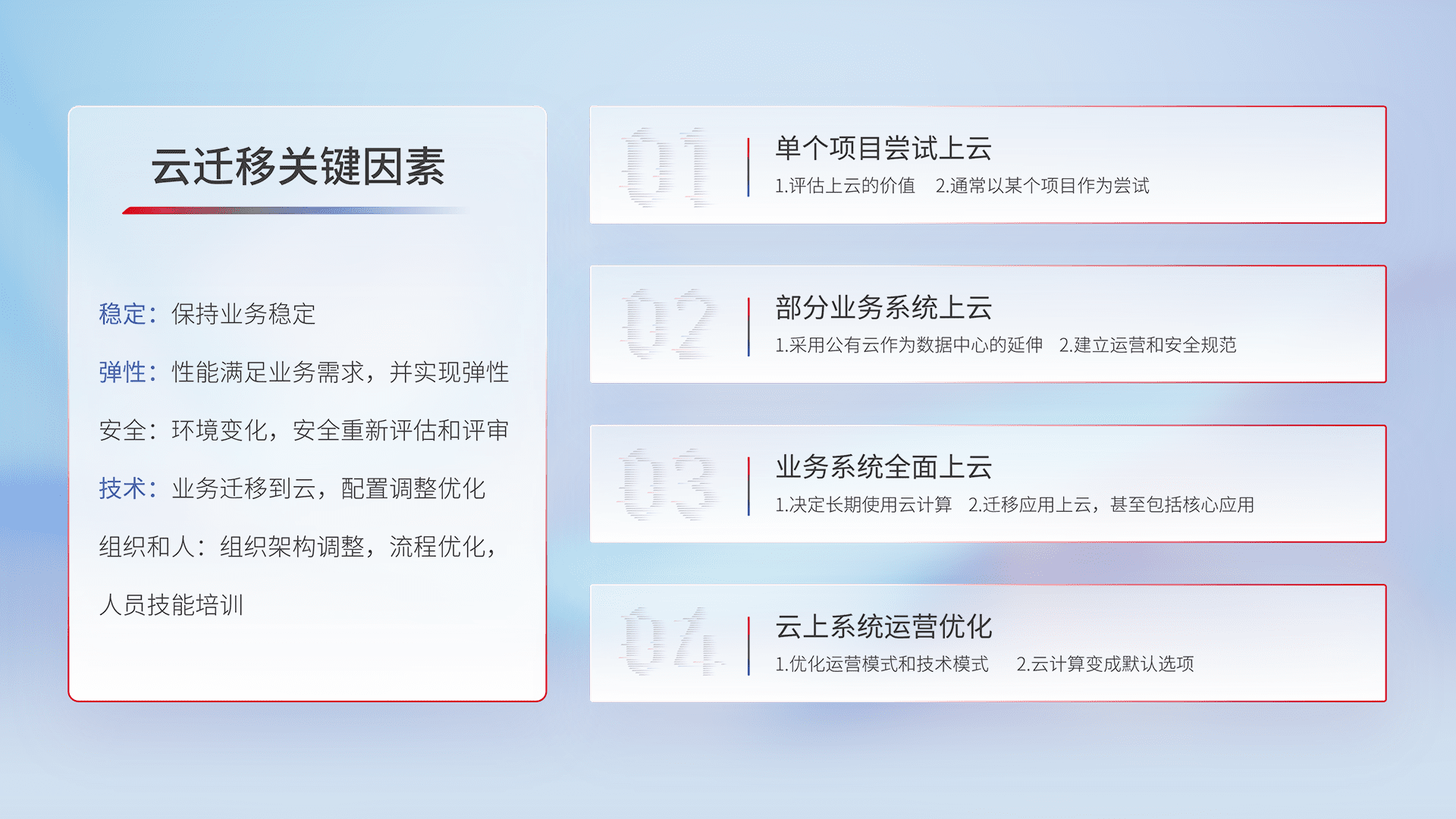 结合实际业务,,,从规划设计、、、云平台选型、、云原生改造、、、、数据迁移、、、、集成交付,,迁移全过程为客户识别最佳上云路径,,,,做好风险识别管理,,设计网络架构、、、、身份权限、、、、安全审计合规、、、、操作审计、、、、日志审计、、、、监控告警策略、、多站点容灾设计等,,对云上基础设施进行整体规划,,提升IT治理水平,,,,以满足弹性、、、高可用、、、、高性能的需求。。