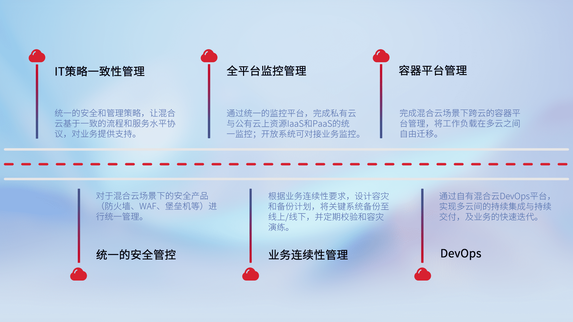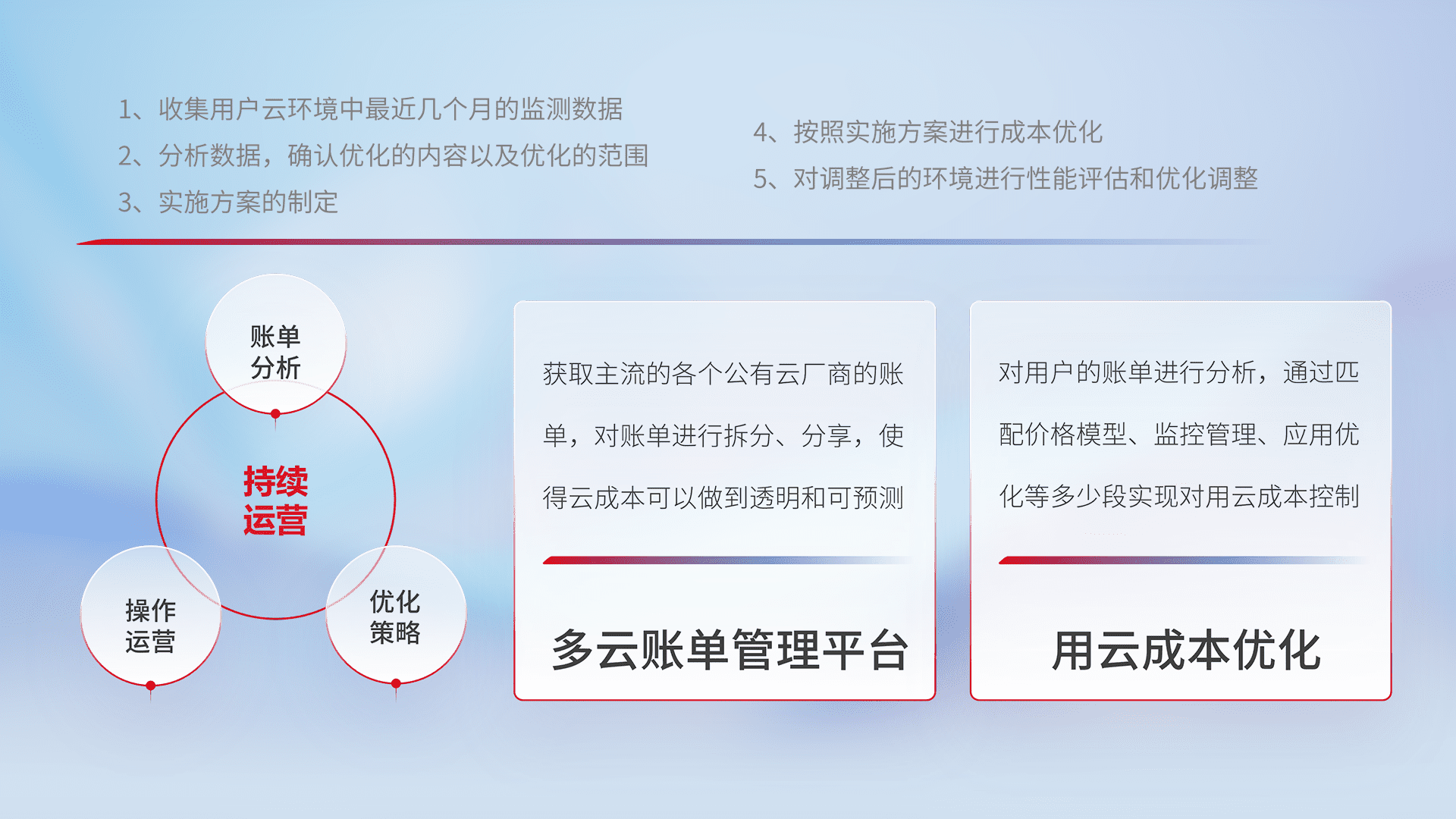 通过多云纳管,,,以统一的资源数据模型把客户的云资源进行抽象和封装,,,进而实现对多云资源的统一操作,,保障云资源管理的可靠性、、稳定性与可用性。。量身定制化运维内容,,配置、、开发运维、、、补丁管理、、备份、、、、监控、、、、认证和访问管理、、、审计和日常巡检等,,,保障在用云过程中的可靠度,,,稳定度以及高可用率。。。。