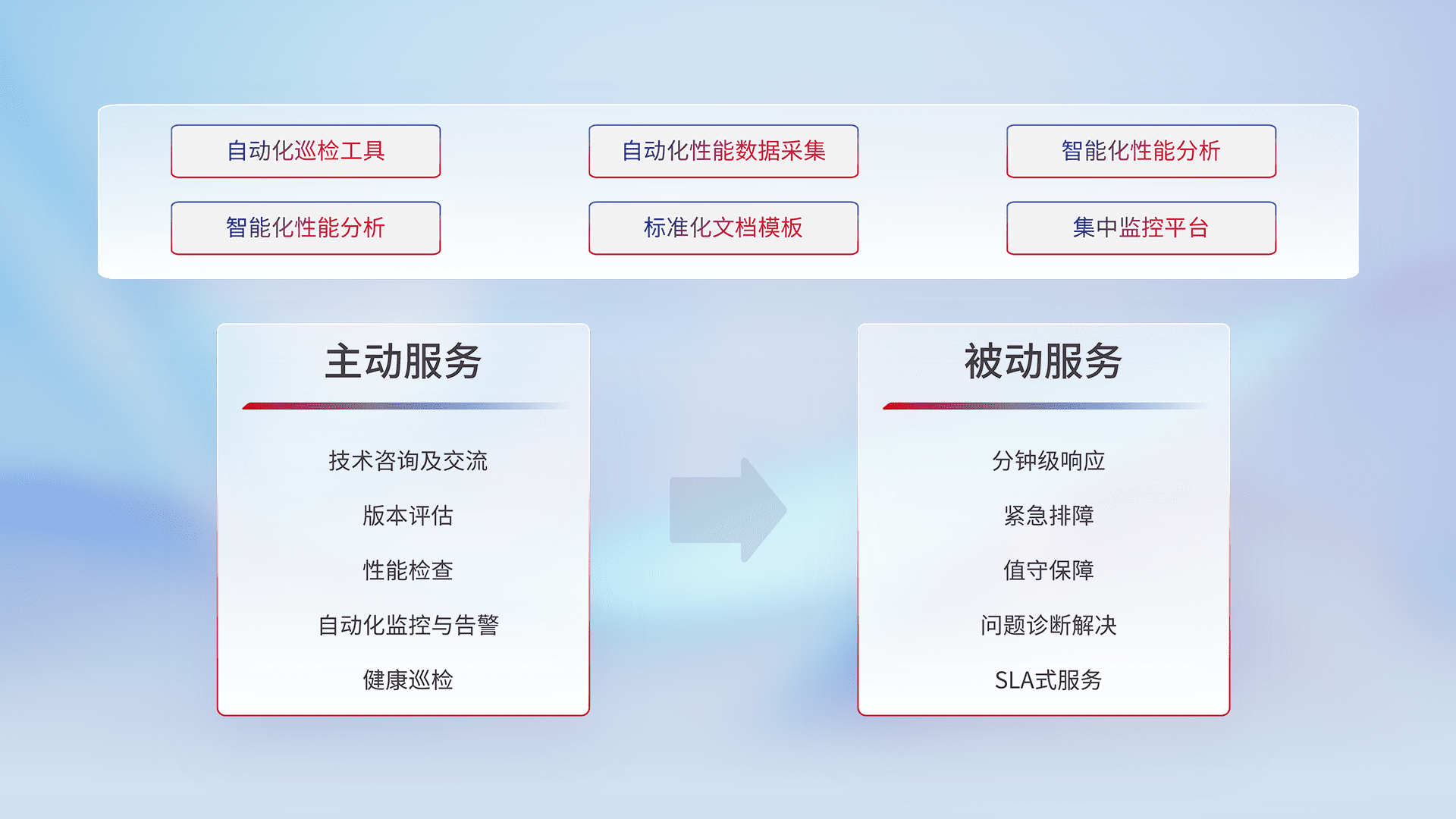 智能化工具和标准化文档,,,保障服务质量,,提供主动服务(包含技术咨询、、版本评估、、性能检查、、、自动化监控与告警、、、、健康巡检)和被动服务包含(分钟级响应、、、、紧急排障、、、值守保障、、、问题诊断解决、、、SLA服务)。。。。